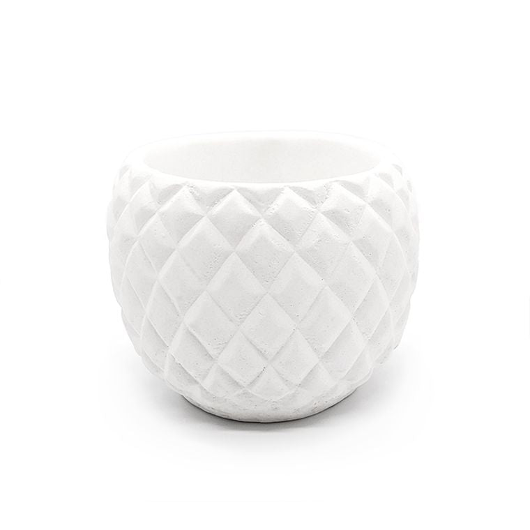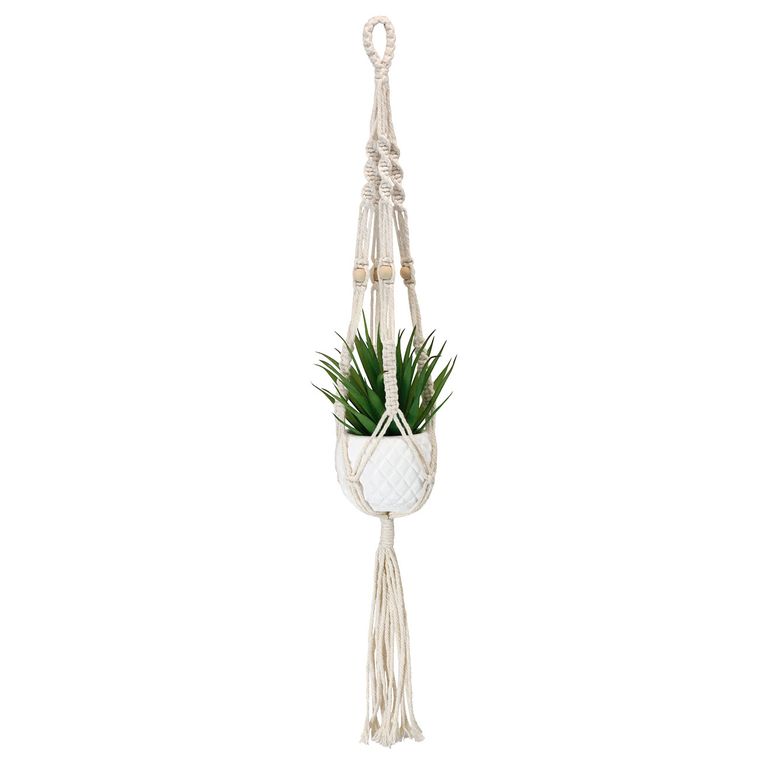 Give your favorite plant a new home in our hanging cast stone pineapple planter. Hung from a beaded cotton rope macrame, this small indoor planter is beautifully etched in a diamond pattern for a pineapple-like effect. Pair with the included green pineapple topper for an instant decor upgrade. Or make it the perfect home for your next small trailing plant.