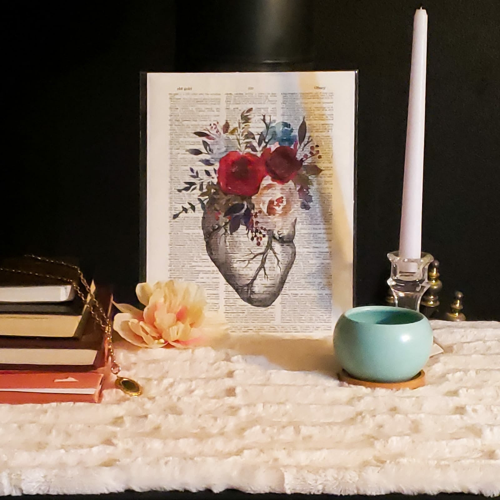 Vintage style print of an anatomical heart with watercolor flowers. Printed on salvaged dictionary pages selected at random ensuring each piece is unique. Hang on it's own to decorate an accent space or add to a gallery wall for a pop of color. Perfect for those obsessed with all thing vintage and academia.